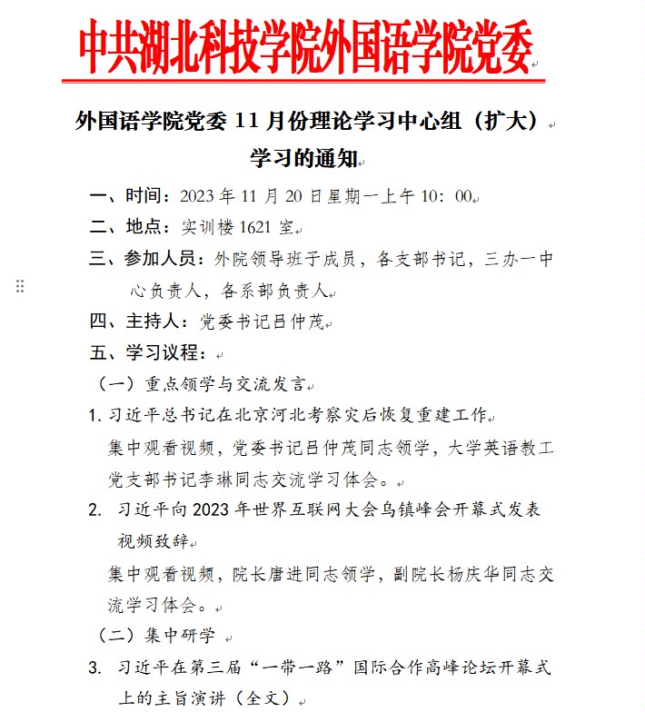 公司党委11月份理论学习中心组(扩大)学习的通知