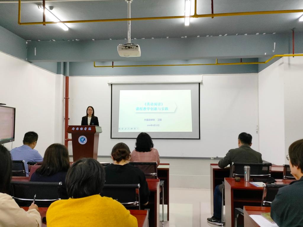卫丽老师以《英语阅读课程教学创新与实践》为题,由卫丽老师主讲的课程《英语阅读》曾在第三届湖北省高校教师教学创新大赛中荣获三等奖。卫老师通过教师教学创新大赛为切入点,以个人备赛过程为案例,分享了如何设计教学活动、制定教学目标、增进师生互动。卫老师表示,参加比赛是促进反思、锻炼能力、提升教学质量的有效途径。教师应在挑战中寻求机遇,充分挖掘个人优势,坚持推陈出新,不断磨砺、蜕变、成长、出众。