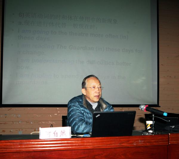 讲座中,何教授从“英汉两种语言常见的矛盾现象”、“词义、词的变化和词与词结合的有趣现象”与“词结构方面的有趣现象”三方面进行层层讲解。他运用实例,深入浅出,通俗易懂。在讲到个别“有趣”之处时,现场笑声一片。