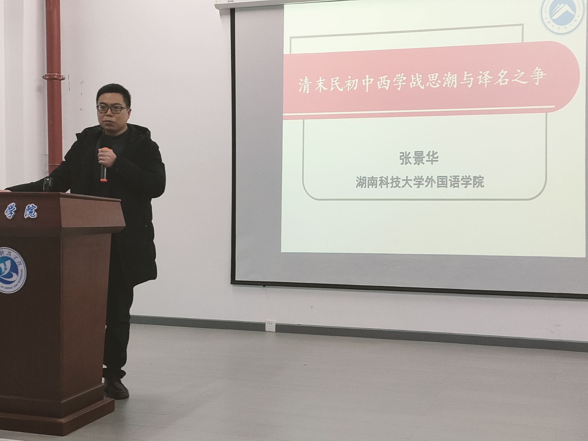 2024年3月6日晚上,在揽胜楼1605室,湖南科技大学博士生导师张景华教授应邀为外院作了名为“清末民初中西学战思潮与译名之争”的讲座。