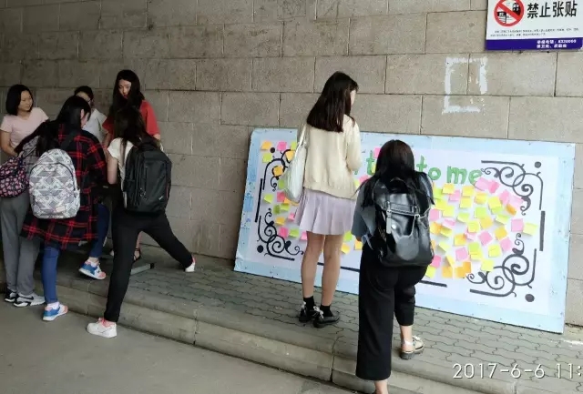 “Don’tlie to me”的手绘海报吸引了许多同学上前观看,他们在便利贴上写下了自己曾说过的谎话,并贴在“Don’t lie to me”展板的“谎言收集区”,表达对曾经说过谎言的追悔。