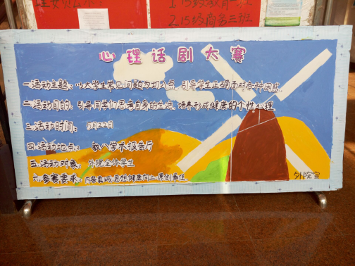 活动开始之前,现场已座无虚席,台上的演员们认真彩排,台下的观众们好奇观看。或生动搞笑或发人省醒或感人至深的情景剧表演让观众沉醉其中;现场互动环节更是震撼全场,两位同学主动给远在家乡的父母打电话,大声说出自己的心里话,一句“我爱你”让现场不少同学感动不已,甚至偷偷的抹起了眼泪。15级七个班级的表演都非常精彩,令人印象深刻的是15级翻译1班的《雨儿》与15级商务3班的《常回家看看》。《雨儿》说:“自闭症儿童都是天上的星星,他们的家庭更加需要社会的关心与帮助。”启发大家关注自闭症儿童,而《常回家看看》则情真意切地道出了父母思念儿女的心声。本次大赛在同学们的掌声中圆满落幕,其中15级商务3班的《常回家看看》凭借出色的演技、真实的情感和感人的剧情赢得了本次心理情景剧大赛的一等奖,可谓当之无愧。