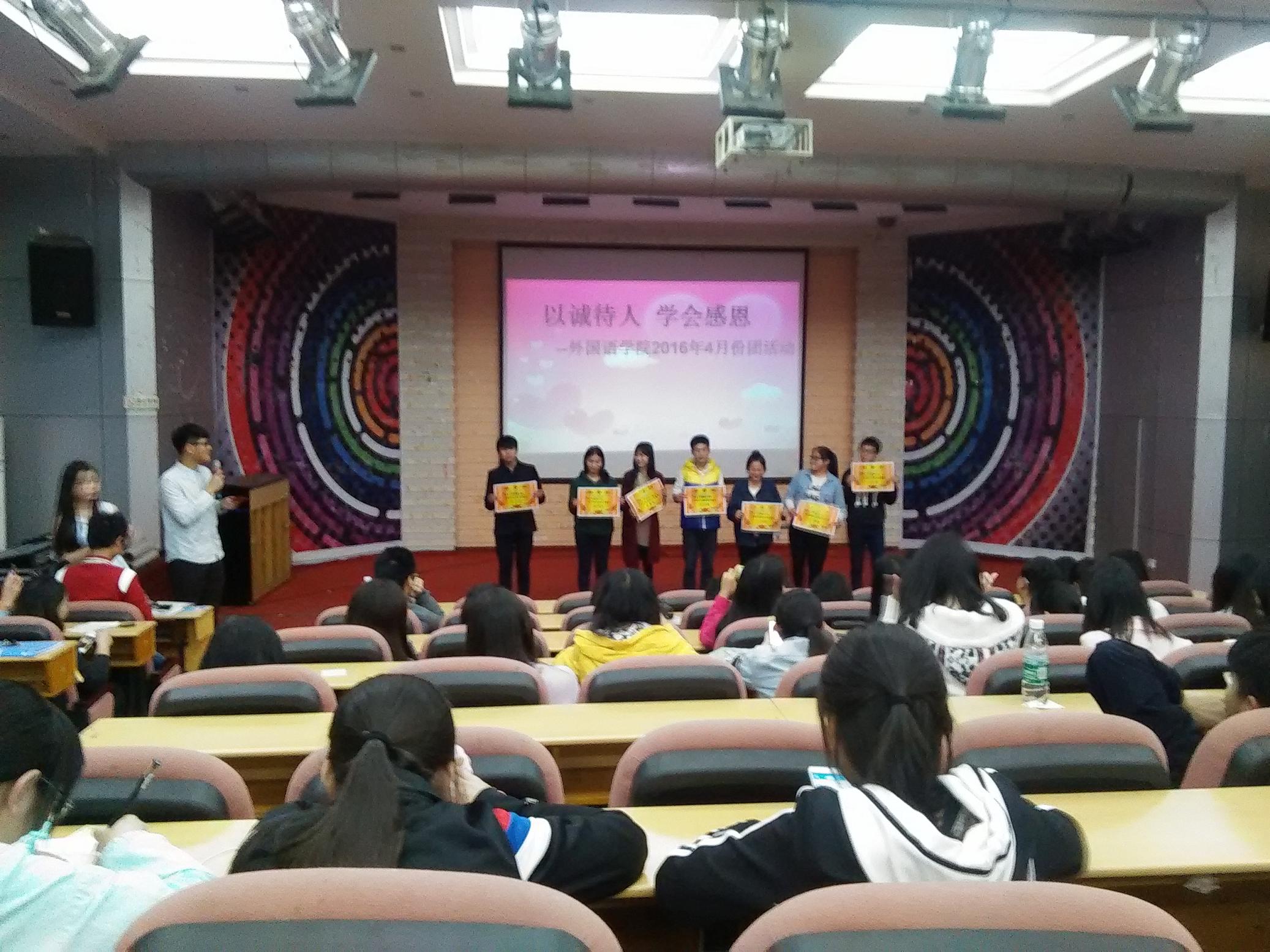 4月17日晚7点,此次活动在教八学术报告厅准时开展。一场精彩的开场舞瞬间点燃整个会场的气氛,拍掌声,欢叫声一浪高过一浪。接着,由各班宣传委员展示其所制作的旨在弘扬“感恩,诚信,教育”精神的宣传海报,海报内容风格迥异各具特色,台下观众看的也是目瞪口呆。并由大众评委在晚会结束时评选出最终胜出者。一曲短暂的《时间都去哪儿了》的演唱给在场观众带来了听觉和视觉上的双重上的享受,那优美的的嗓音、那动听的旋律传达的是爱的力量。有那么一双大手在你跌倒时会将你轻轻扶起,在你哭泣时会帮你弹去眼角的泪珠,他用粗糙的双手为你撑起一片蓝天,用爱为你铸造一个温暖的家。一段短视频《父亲》的分享感动了多少人?催下了多少泪?然而,更精彩的互动环节激起了观众们的兴趣,主持人让在场的所有观众写下最想感谢的人并带上先故事由主持人抽取幸运观众与大家分享他最想感谢的人。一个个真实的故事,一段段感情的流露,爱是永恒的力量。临近尾声,主持人宣布了海报评比的结果,商务三班的郭宸同学夺下了此次的冠军。相聚总是短暂,欢乐总是太快。在一场《感恩的心》的手语表演中,结束了此次活动。
