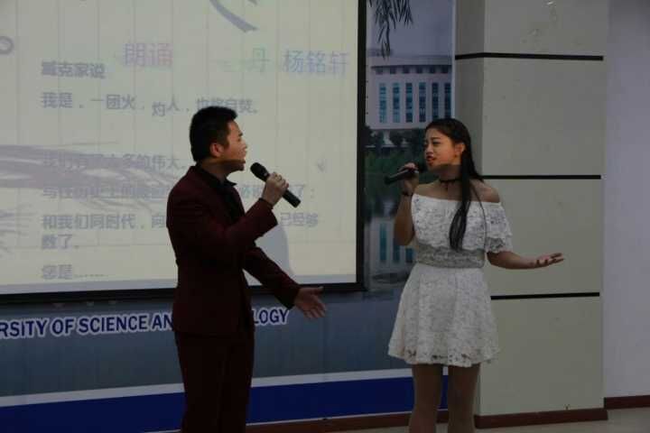 来自15级教育一班的杨铭轩、王丹以团体组合的形式参赛,通过前期预赛和复赛的重重选拔,成功突围,进入决赛。他们朗诵的作品是著名爱国主义诗人臧克家的诗歌《您是》:“您是泰山的顶峰, 崇高又坚硬; 您是冲过三峡的长江, 汹涌奔腾...”充满豪情的诗句被两名同学以真挚的情感和标准的普通话演绎的淋漓尽致,他们以满腔的热忱感染着每一个人,给台下观众带来一次精神上的洗礼,赢得了全场观众一次次共鸣的掌声。最终,杨铭轩、王丹两名同学以优良的台风、深挚的感情赢得评委和观众的一致好评,最终荣获此次朗诵大赛的三等奖。