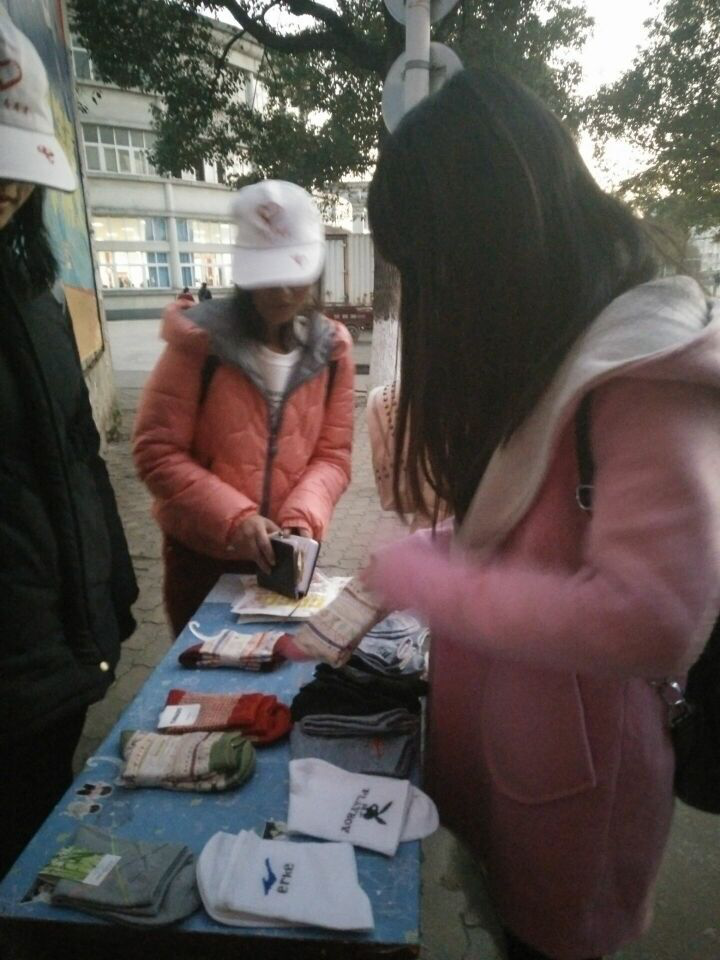 此次活动分为“爱的抱抱”和“义卖”两个部分,在桥洞、新区超市及老区超市三个地方同时进行。在“爱的抱抱”活动中,志愿者们主动为每一位前来送爱心的同学送上“爱的抱抱”,用微笑和热情感染着每一个人,拉近了心与心的距离,严寒的冬日也因这个拥抱变得温暖生动起来。这边“爱的抱抱”活动开展得如火如荼,那边的“义卖”活动也热火朝天地进行着。志愿者们通过义卖袜子和暖宝宝的方式为贫寒学子筹集善款,并耐心地向过路的同学解释此次活动的意义,前来购买物品的同学渐渐多了起来,志愿者们忙得不亦乐乎,他们用真诚换来了同学们的尊重与支持。夜幕渐渐降临,此次爱心活动也接近尾声,活动虽然已经结束,但志愿者们的辛勤付出却让人印象深刻,寒冬里的暖情也将留在每个人心底。据悉,本次志愿者活动所筹得的全部善款都将用来给贫寒学子送去物质上的帮助。
