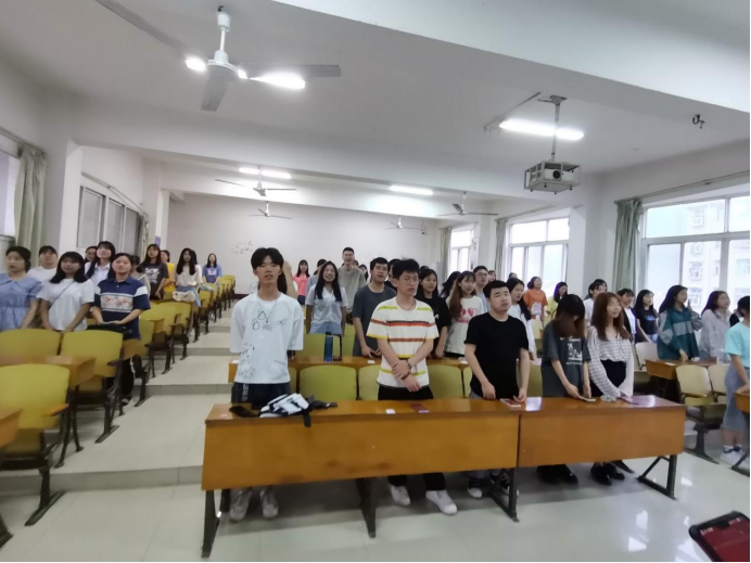 本次团日活动采取交流研讨会的形式举行。由于多媒体出现故障,各班团支书将PPT发送至班群,并组织同学们通过手机学习相关文件。活动伊始,各班团支书组织本班同学齐唱国歌,嘹亮的歌声萦绕于教室中,在增强了同学们爱国热情的同时,也为本次的团日活动作了一个良好的开端。