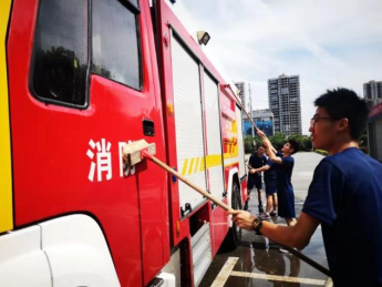 为了让志愿者能够更好地学习消防相关知识,消防员班长吴海朋带领志愿者们来到了赤壁市东风路消防救援站,学习与认识了消防相关器械,了解了消防相关知识及其背后的科学性,并参观了消防员休息室、训练室、消防器材库等场所,进一步拉进了志愿者们与消防员的距离。同时,志愿者们在参观结束后还与消防员们一起进行了消防车的清洗工作。他们扛起喷水枪,拿起清洁刷与抹布,细致地刷洗着消防车上的污垢,劳累的同时也感受着快乐,灿烂的笑容洋溢在他们每个人的脸上。