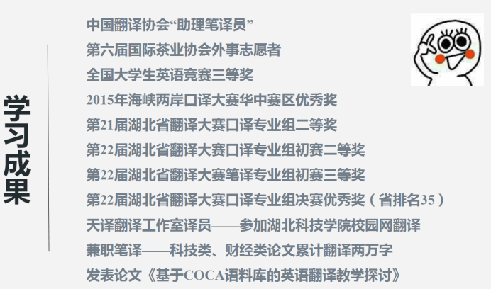 在学习上她永远全力以赴,她认为,作为一个员工,最本质的任务就是不断汲取知识的营养,不断求知探索,不断与时俱进,没有人可以走到学习的尽头,所以尽可能保持一颗求知的心,不论是在家庭中、公司里还是社会上,都有值得我们学习的人、事、物。所以她不仅取得了良好的学习、活动成绩,更积极参与社会实践,拉起了属于她自己的一个培训班。