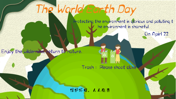 世界地球日即每年的4月22日,是一个专为世界环境保护而设立的节日,旨在提高民众对于现有环境问题的意识,并动员民众参与到环保运动中,通过绿色低碳生活,改善地球的整体环境。
