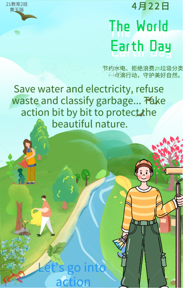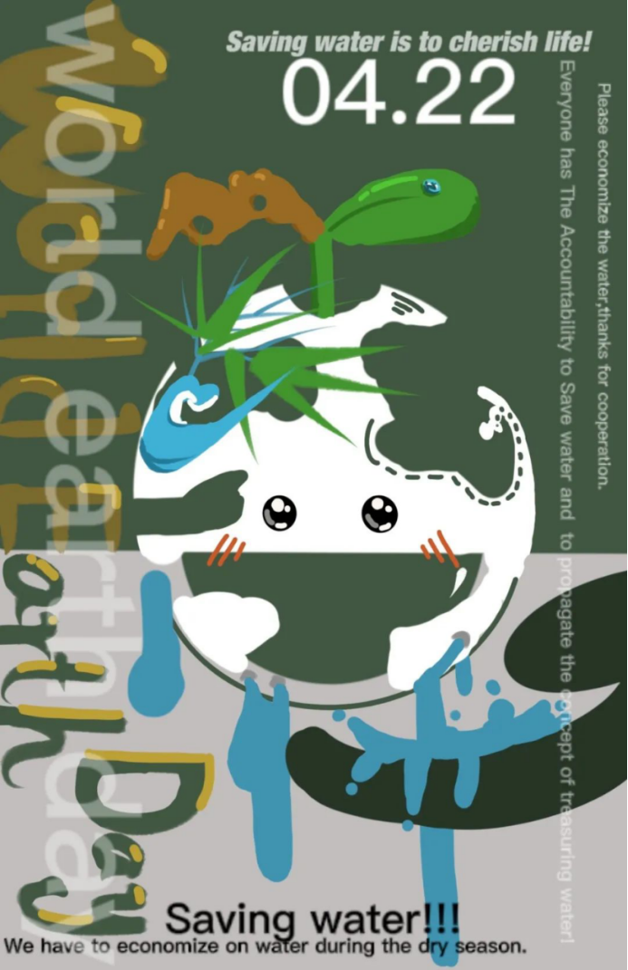 设计理念:世界地球日是4月22日,我希望这一天都是美好的,天空海鸥飞翔代表着和平,小溪清澈代表自然美好。人们参与劳动辛勤耕种,想要为世界的环境做出一份贡献,在这一天,人们都会植树造林行动起来。让我们一起共同维护地球这个美好的大家庭,参与守护环境,保卫家园的行动。我们要牢记节约用水,拒绝浪费的美好传统理念,共同发扬我们优秀的中华传统文化,保护自然,创造一个美好的地球。