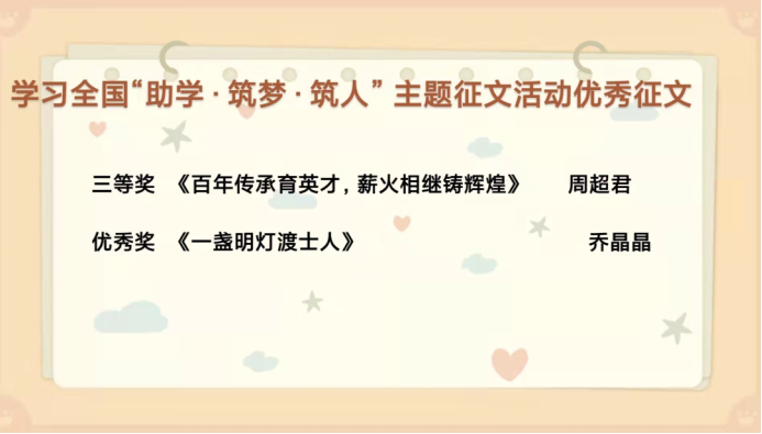 本次班会以PPT讲解、传阅优秀征文、交流讨论等形式开展。班会过程中,各班生活委员带领同学们学习全国“助学.筑梦.筑人”主题征文活动中的优秀征文并深入了解了国家相关资助政策。百年党史,熠熠生辉;国家资助,励志青春。国家资助政策滋养了一批批青年员工,成为其漫漫求学路上那希望的曙光。许许多多关于成长、励志、感恩的故事在同学们身边上演,激励着外院学子继续向前。