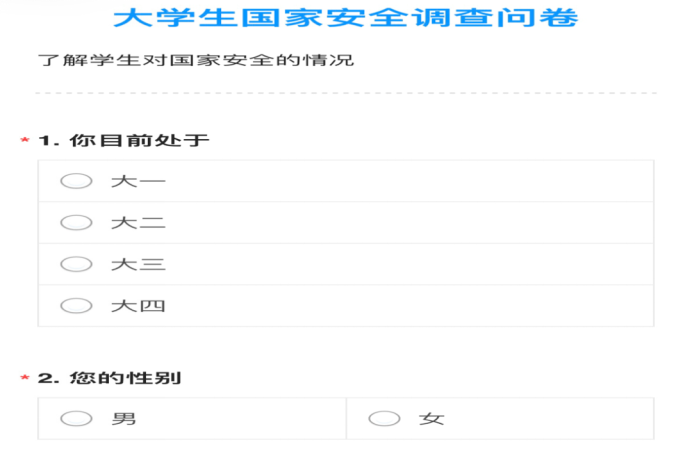 为做好“4·15”全民国家安全教育日宣传教育活动,了解外院全体同学对国家安全相关知识的学习与掌握情况,提高其对国家安全问题的重视,并让他们懂得如何依法履行自身维护国家安全的责任与义务,意昂体育于4月18至19日开展了老员工国家安全问卷调查活动。