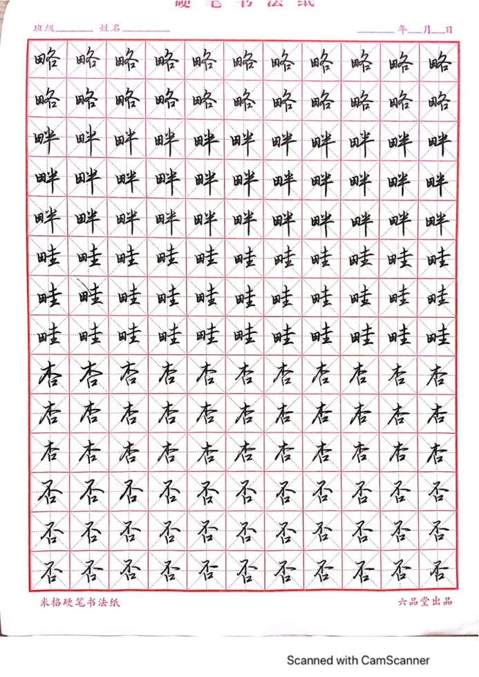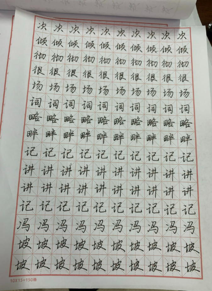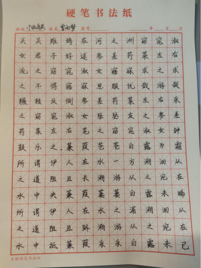 “我觉得这次的练字活动对我来说真的很有意义,因为它让我学会了坚持。练字对我来说是一种享受,一种乐趣。练字时我会先模仿视频里面老师的字迹,那时就会惊叹老师的字迹多么漂亮,就很崇拜,然后自己就会认真地去琢磨该如何写成老师那样。我认为练一手好字没有诀窍,只要你有一颗能够坚持到底的决心。每次练完之后看着自己工工整整的字迹我都会觉得心情舒畅,很有成就感。”