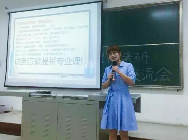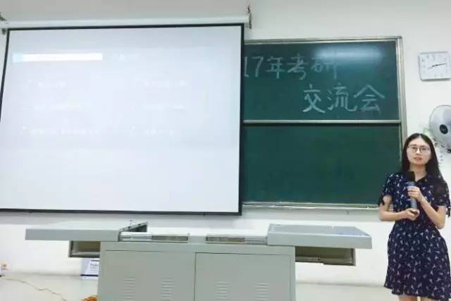 首先进行交流分享的是考取华南师范大学小学教育专业的13级教育班的孙卓学姐,以猎犬和兔子间的寓言故事引入了此次交流的主要内容,找到适合个人的学习方法、有效把握身边的资源、坚定理想信念并为之锲而不舍、不厌其烦的日夜攻读等皆是她的金玉良言。